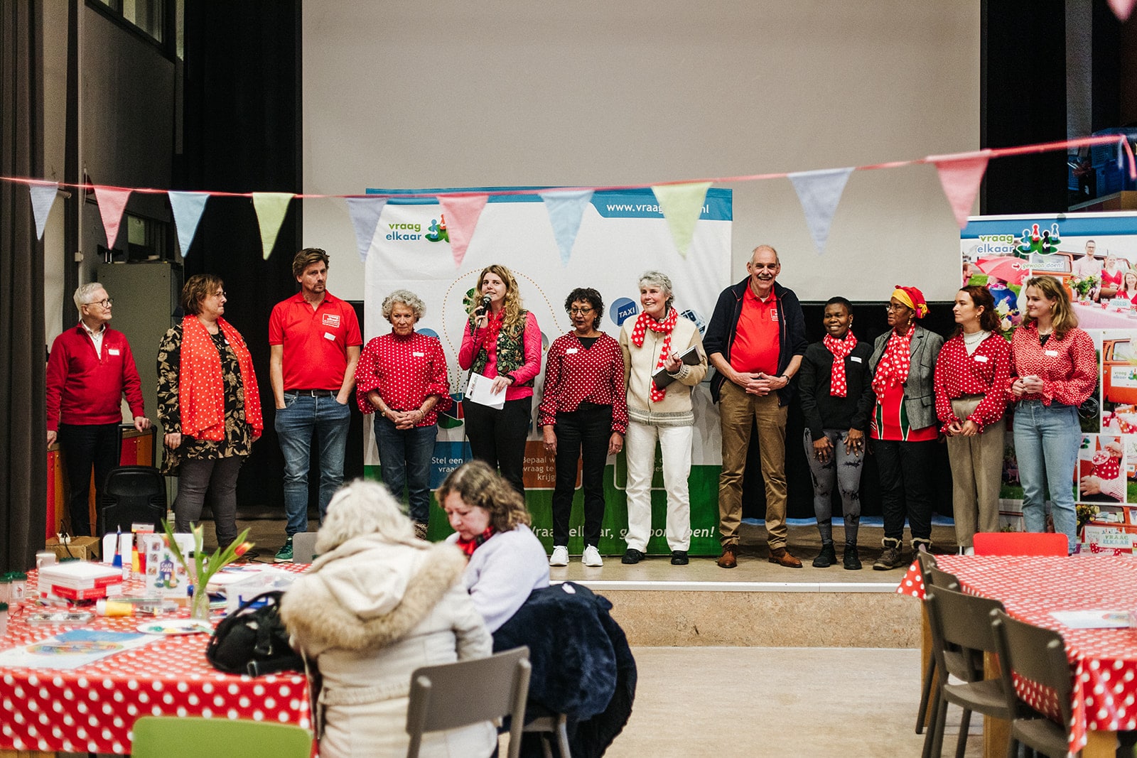 Zoals altijd sierden de rood met witte kleden het Vraagelkaarcafé, ditmaal in de Mussen in Den Haag. Het doel van het Vraagelkaarcafé is om mensen te verbinden voor duurzaam contact. Zodat mensen ook gaan afspreken als we niets organiseren. Dan kan er iets ontstaan wat nog veel krachtiger is: vriendschap. Deelnemers konden genieten van verschillende workshops, yoga, filosofie, schilderen et cetera. Coaches en vrijwilligers brachten de deelnemers met elkaar in contact om ook na de activiteit met elkaar af te spreken.